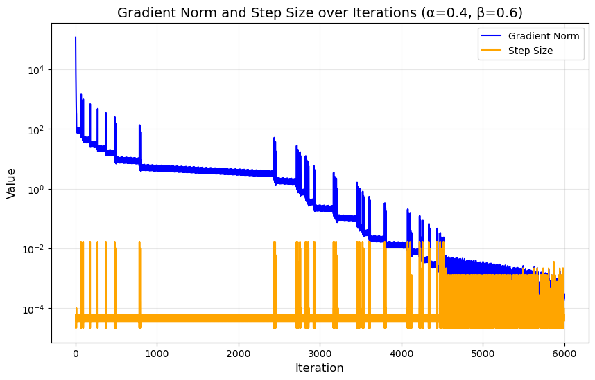 进一步看,绘制出 α = 0.4, β = 0.6 这组参数的收敛曲线令人惊讶。不同于右侧 (0.5, 0.9) 典型的大振幅持续有规律的下降,这组参数的步长曲线几乎是完全平坦的水平线(除了初始阶段和个别跳跃点),好似正好找到了一条最均匀的下降路径,同时震荡情况在很多状态都未出现。我们可以得出结论:尽管从常识上,大 α 大 β 可以使梯度下降有效进行,但也存在某些特殊的参数对,恰好在下降条件的严格性和步幅变化幅度中找到平衡,是”恰到好处”的巧合组合。