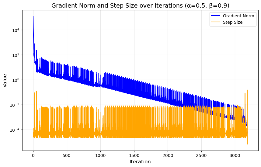 当 α 较小时,Armijo 条件松弛,每次梯度下降的下降量并不充分。可以看到尽管在前两张图中,四种颜色有所差异,但观察其梯度下降的量级都在 1 附近,没有明显差异,这时 α 主导收敛趋势,β 的差异体现得并不明显;