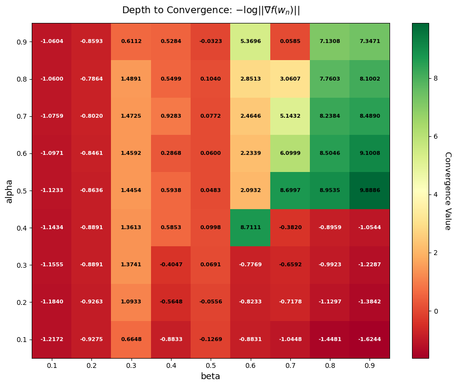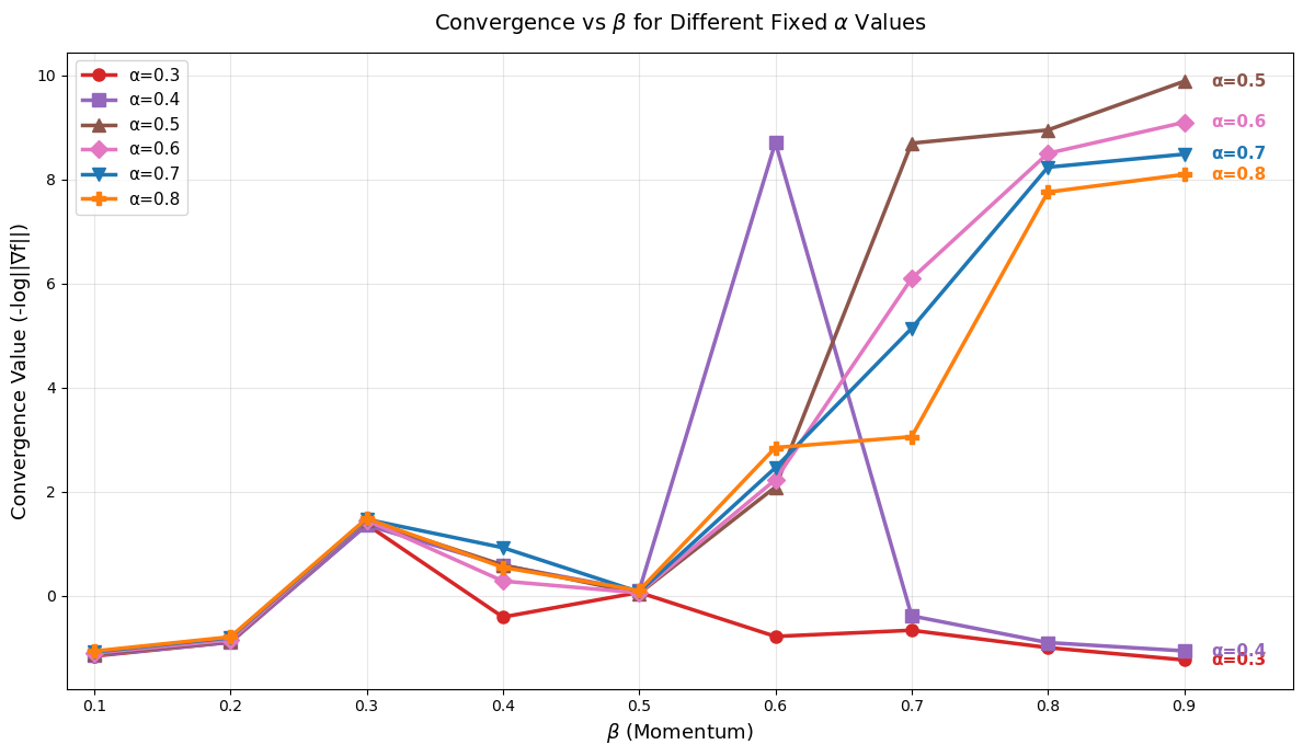 可以发现这与之前分析参数对的结果完全一致:α 较大时,β 值主导收敛,β 越大收敛越好;当 α 较小时,α 主导收敛,整体效果上限较弱,且 β 对收敛影响较小。