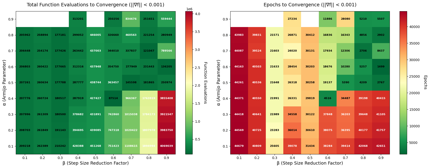 w_{k+1} = w_k + t_k * d_k的 Epoch 数角度,如果需要让 Armijo 条件有效控制函数数值的下降,较大的 α 是合理选择;同时每次下降的步幅期望尽可能大,进而较大的 β 可以保证有效收敛。整体上大 α 和大 β 配对是合理的,但参数选择不应使用贪心思想,而是通过微调参数实现动态平衡。在本案例中,$(\alpha, \beta) = (0.4, 0.6)$ 就是这样一个达到动态平衡的点。从总计算开销来看,如果假设各种计算操作的复杂度相似,那么只要不是小 α 搭配大 β,在总计算开销上差异性不大。大多数时候 epoch 数量和线搜索循环的效率会形成互补关系。在本案例中,动态平衡点 (0.4, 0.6) 为收敛效率最高点。
