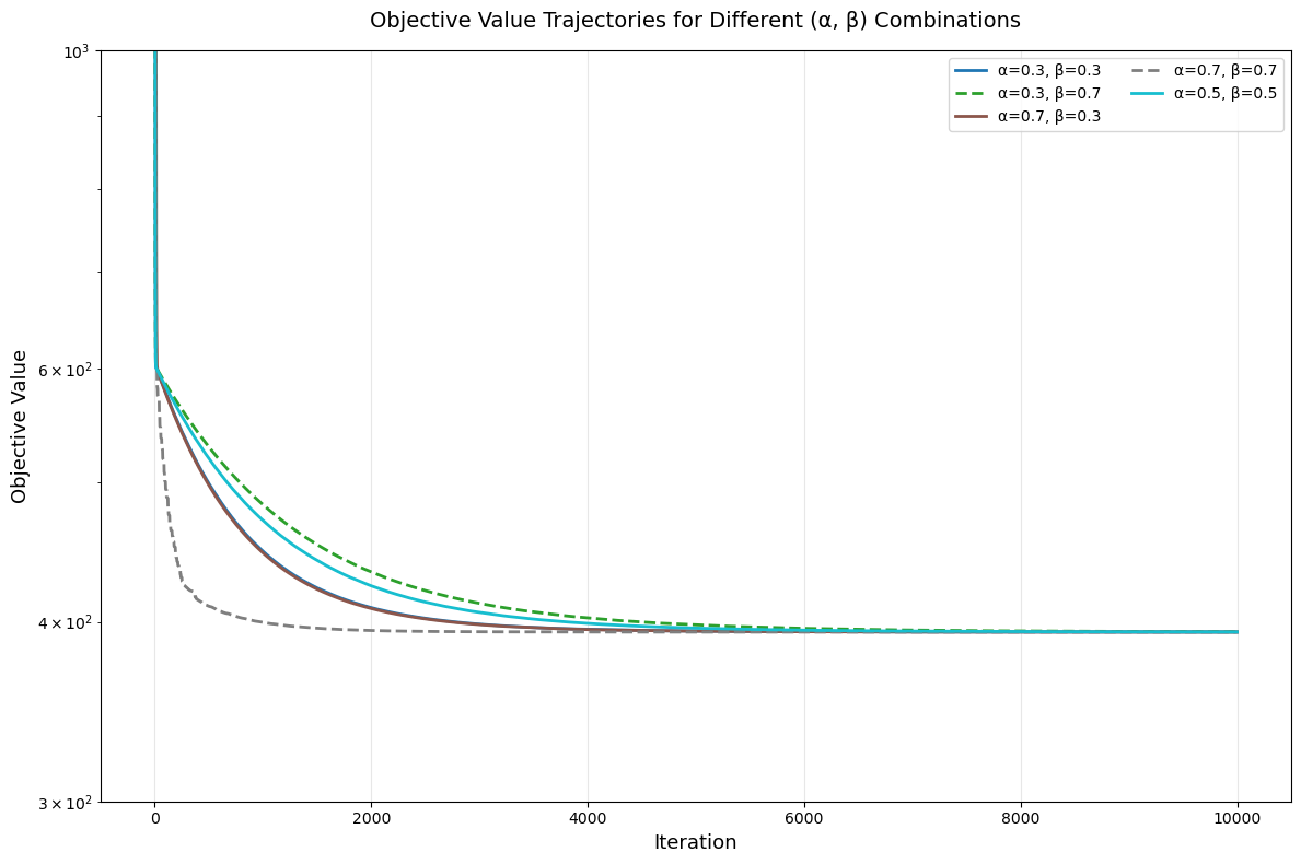 - 参数耦合效应:大 α 和大 β 的组合通常表现良好,但存在特殊的”平衡点”,如 (α=0.4, β=0.6) 在本问题中表现出奇迹般的收敛效果,震荡小、收敛快、计算开销低