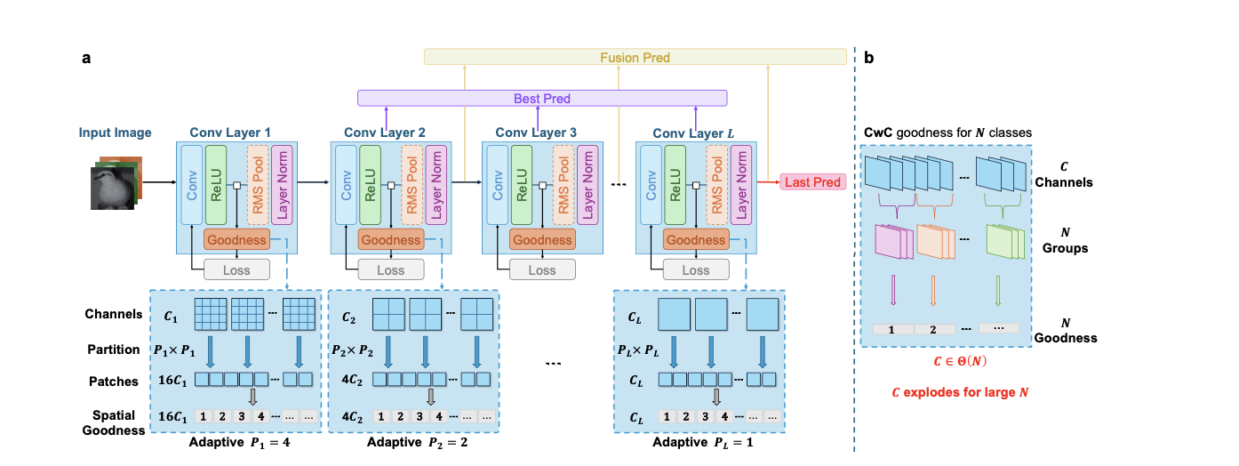设计原理:浅层($C_l$ 小)→ $P_l$ 大 → 更细粒度的空间分割;深层($C_l$ 大)→ $P_l$ 小 → 更粗粒度的空间分割,进而得到 $P_l \times P_l \times C_l$ 个区块,对于每一个区块都有一个goodness评估值中$c \in \{1, 2, \ldots, C_l\}$为通道索引,$i, j \in \{1, 2, \ldots, P_l\}$为patch的空间位置索引